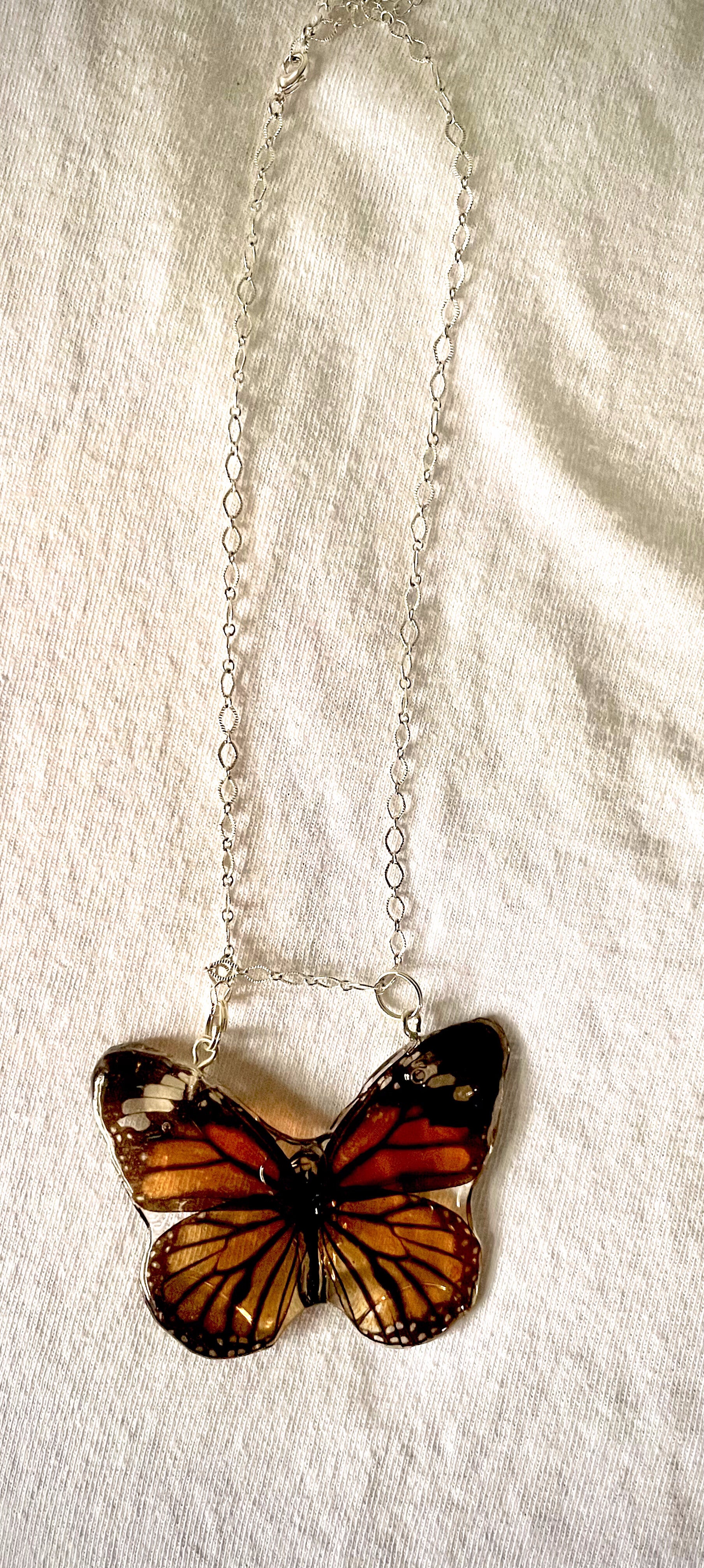 Real Preserved Monarch Butterfly Pendant Necklace on Silver Chain